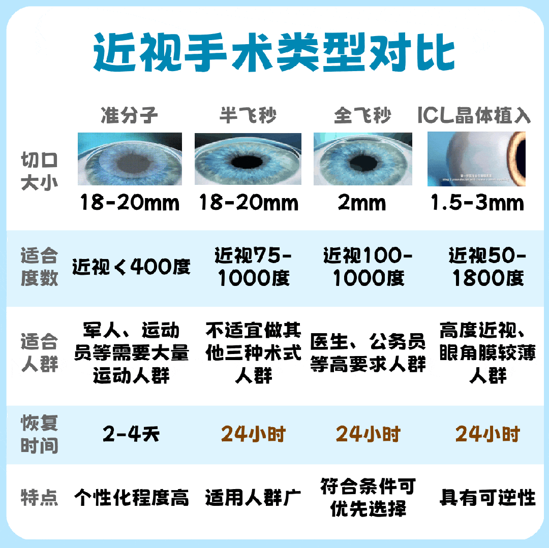 目前近视手术主要有三大类:全飞秒、半飞秒、晶体植入。